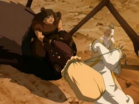 The canyon guide warns them not to take any food into the canyon, every bit food attracts dangerous predators in the canyon. The two tribes, the gang, and the guide brainstorm their descent to the canyon floor. Afterwards the guide breaks a rock shelf so that potential Fire Nation soldiers cannot follow them, a canyon crawler assaults them. Aang and his friends fend it off, but not before information technology attacks the guide, breaking both of his arms and rendering him unable to earthbend. With no other earthbenders in either of the groups, Aang realizes that they are now imprisoned in the coulee. Both tribes begin to fence over again and finally make up one's mind to split upward. As the tribes each arraign the other for the assail, Aang furiously orders them to separate and travel in two separate groups. As they dissever, Aang, curious as to why the two factions concord such animosity toward each other, asks Katara and Sokka to accompany the Gan Jins and the Zhangs, respectively, and try to notice the reason for their feud.